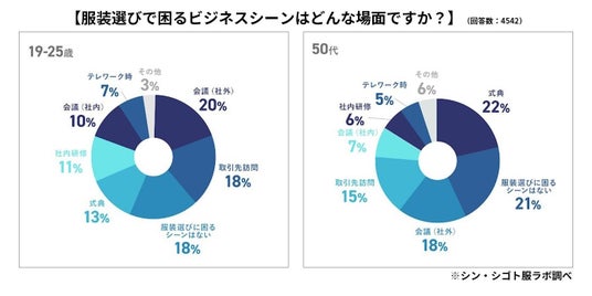 ・新入社員含む若手社員の約4割が会議や訪問など社外に出向く際の服装に悩んでいるのに対し、50代では式典と回答。世代によって服装に悩む場面が異なることが明らかになりました。そこで、若手のシゴト服の悩みに着目し、「#つながるシゴト服」プロジェクトが立ち上がりました。