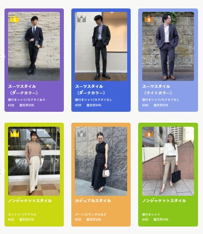 本サイトには、12,000名以上のビジネスパーソンに着用頻度の高い仕事服を調査※した結果が反映されています。業界や職種に加え、客先訪問や社内業務といったビジネスシーンごとに、着用傾向をランキング形式で表示します。また、世代別の着用率も閲覧できるため、安心してその場にふさわしい仕事服を選べるほか、これまで着用していなかったスタイルを発見するきっかけとしても活用できます。