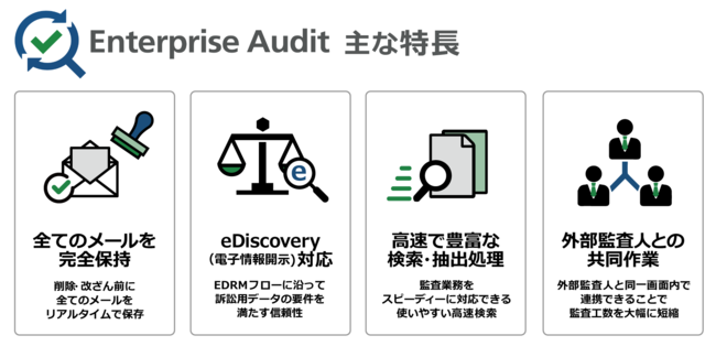 本製品は、企業のリスクマネジメントにおける監査・訴訟対策を強化するメール監査システムです。社員が送受信するすべてのメールとチャットを削除・改ざん不可の状態でリアルタイムに完全アーカイブ保持し、より厳密なデータ管理環境を提供するだけではなく、万が一、民事訴訟が行われた場合には、高速な全文検索機能により膨大なメールデータから迅速かつ正確な情報を取り出すことができます。また、組織内部と外部監査人がシームレスに連携して監査業務を効率よく実施できるので、訴訟による企業への悪影響や被害等の拡大防止に貢献します。