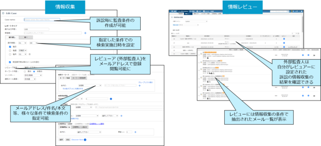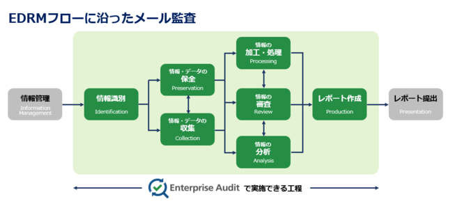 『Enterprise Audit』は、『MailBase』の機能をベースに、eDiscovery(※2)を行う際の手順であるEDRM(電子情報開示参考モデル)のフローに従い、監査業務を迅速かつ正確に行うための機能をさらに強化しました。