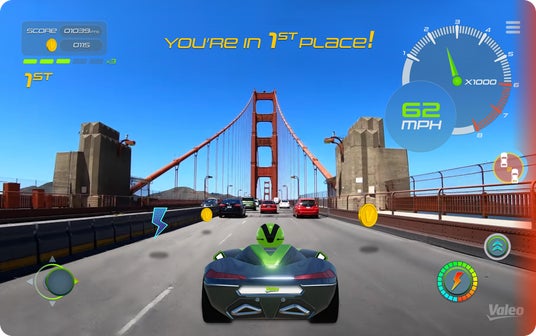 ヴァレオ・レーサーは、車両のWi-Fiに接続されたスマートフォンやタブレットでプレイできる乗客向けのヴァレオ独自の拡張現実 (XR) ゲーム体験です。ヴァレオが開発したソフトウェアによって、このゲームは車両の運転支援システム (ADAS)のカメラとレーダーと、すでに搭載されている認識・AIアルゴリズムを使用して、車の実際の環境をゲームに挿入します。これは、これまでにないゲーム体験となります。