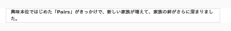 「Pairs」では、2012年10月のサービス開始以来、数多くのシングルに出会いの場を提供してきました。これまで30万人以上から交際・入籍報告が届いており※1、弊社が実施した調査によると「過去1年以内に結婚した」と答えた調査対象者のうち約4%の人が「Pairs」で結婚相手を見つけていることが分かりました。※2さらに、元Pairs会員の方から出産報告を多数いただいております。このように交際・結婚だけでなく、少子化傾向にある日本社会において「Pairs」を通じて多くのお子様が生まれています。