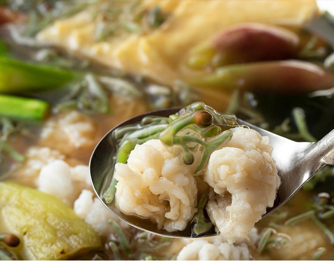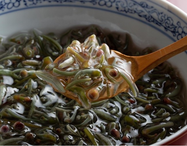 茶色く見えるのが蕾です。福田家では、蕾のある小さなじゅんさいだけを使います。じゅんさいのゼリー質が厚く、やわらかいのが特徴です。噛むとプチっと弾けるような食感が楽しめます。