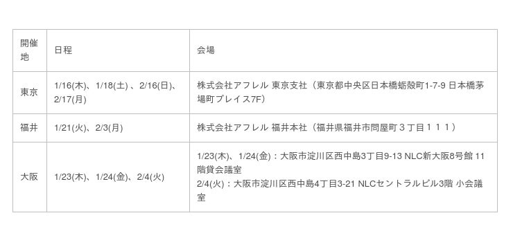 株式会社アフレル (所在地:福井県福井市、代表取締役社長:小林靖英、以下アフレル)は、全国各地から個性豊かな人材を採用するべく2021年3月卒業見込の方を対象に「アフレルの新卒採用7方式+AI」を1月16日(木)より実施いたします。2021年新卒採用では対象者それぞれの「個性・志」と出会うために「総合会社説明会」や「直接社長と話す会」など様々な会を開催する他、新たに「AI」人材の特別採用を追加し、AI分野のスキルは社会でどう活かされているのか等の質問に社員が直接お答えする「アフレルAI事業を推進するメンバーと直接話ができる会」を開催いたします。何をしている会社?自分はどんな活躍ができそう?そんな疑問やリクエストに、東京や大阪、福井、さらにはあなたの街や学校で人事アドバイザーがお応えします。皆さまのご応募をお待ちしております。(https://afrel.co.jp/company/recruit/employment/recruit2020)