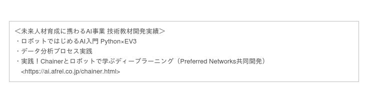 アフレルは、知的な感動を生む新しい技術、教材、トレーニングの提供を通して、未来を生み出す”人材” の育成を支援したいと考えています。AI(人工知能)、機械学習(マシンラーニング)、深層学習(ディープラーニング)、 そのいずれもがバズワードとして消費されている今こそ、正しい知識を得る場やより多くの人が先進的な技術を理解できる環境を用意し、高度な試みに飛躍するためのきっかけを提供する価値があると考えます。新規事業であるAI事業では、データを利用し、人類の将来に豊かさと飛躍的な成長をもたらす新サービス、新製品を創出できる人材育成サービスを展開しています。(https://ai.afrel.co.jp/index.html)
