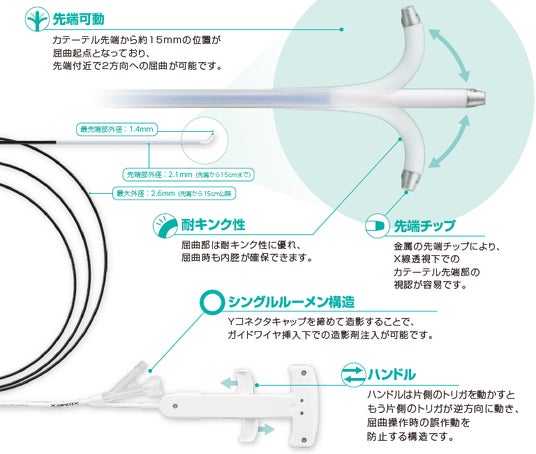 「ゼメックス先端可動カニューレ」は、内腔に通した駆動ワイヤにより、先端部を2方向に屈曲できる製品です。屈曲部の素材にePTFE(人工血管にも採用されている耐キンク性に優れた素材)を使用することで、カテーテル先端付近での急峻な屈曲と内腔確保を実現しています。ERCP(内視鏡的胆管膵管造影)検査や内視鏡的胆管処置では、ガイドワイヤを目的部位に誘導させるためにERCPカニューレ(カテーテル)を使用しますが、従来は可動機構を有しない製品が多く、可動機構を有するものでも、折れやすさや屈曲角度の小ささ、狭い管腔内では屈曲性能を活かせないという課題がありました。当社が滋賀医科大学と研究を進めてきた技術をERCPカニューレに展開し、先端付近での急峻な屈曲を可能にしました。