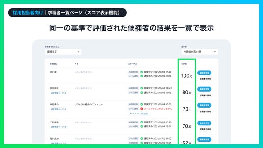 従来の2段階評価に加え、採用企業別にカスタマイズした評価基準に合わせて、AIが客観的評価をスコアで表示します。求職者の強みや伸びしろを高い粒度で比較検討できると同時に、求職者の総合評価を100点満点で表示し、全体の平均スコアとの相対的な位置付けを確認することが可能となりました。その結果、新卒採用の1次面接から中途採用における面接まで幅広く対応でき、今まで以上に公平な評価を提供できるようになります。