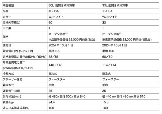 60L 前開き式冷凍庫(JF-U6A)・33L 前開き式冷凍庫(JF-U3A)の概要は以下の通りです。