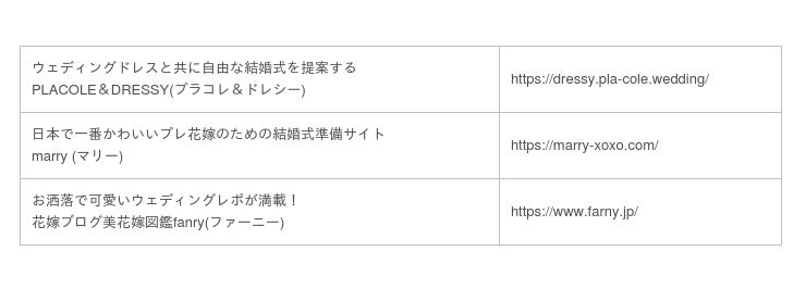 一言で"ウェディング情報を発信する"メディアと言っても、コンセプトや記事内容、Instagramで発信する内容は全く異なる3メディア。PLACOLE&DRESSY(プラコレ&ドレシー)では、ウェディングドレスと共に自由な結婚式を提案し続け、marry(マリー)は、世界中の可愛いを集めてきゅんとする毎日をお届けし、そして美花嫁図鑑fanryは実際の花嫁がリアルなウェディングレポを発信する花嫁ブログとして運営しております。異なる発信をするからこそ違った魅力が存在し、多くの花嫁から共感を呼ぶメディアとして共に尊敬し合いながら、同じブライダル業界において、成長し続けています。