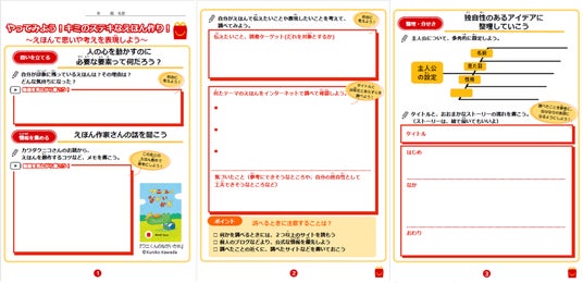 このコンテンツでは、えほん製作を通じて、 例えば小5・ 小6国語の学習指導要領にある「書くこと:文章全体の構成や書き表し方などに着目して、文や文章を整えること」や「読むこと:人物像や物語などの全体像を具体的に想像したり、表現の効果を考えたりすること」に紐づく単元等と連動して、思考・判断・表現力を育むプロセスを実践できる探究学習を提供予定です。