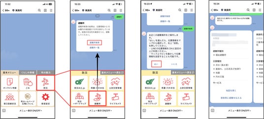 基本メニューの「防災」→「避難所」→「避難所検索」から起動することができます。