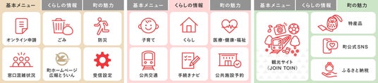 「基本メニュー」「くらしの情報」「町の魅力」のメニューから様々な情報を検索することが可能になりました。