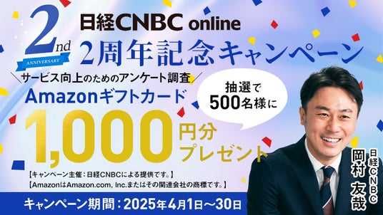 「日経CNBC」をご利用の皆様に向けた「日経CNBC・日経CNBC online『サービス向上のためのアンケート調査】」を4月1日(火)から4月30日(水)まで開催します。アンケートにお答えいただいた方の中から抽選で500名様にAmazonギフトカード1000円分をプレゼントいたします。
