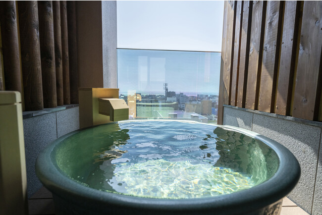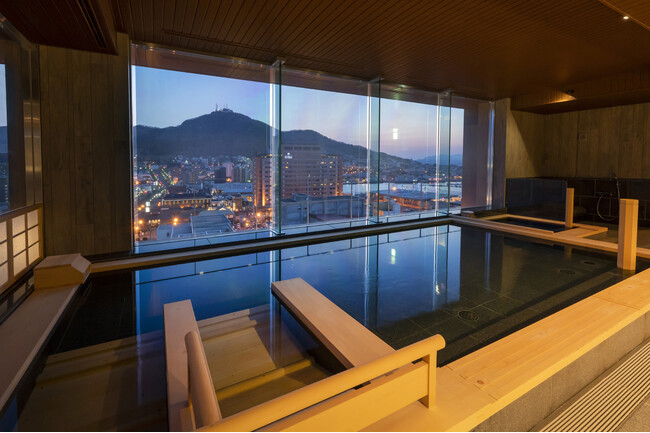 上層階にある大浴場では、内湯(檜風呂・寝湯)、露天風呂、樽風呂、ドライサウナ、岩盤浴、水風呂を完備しており、函館山を目の前に、世界三大夜景のひとつに数えられる街並みを眺めながら天然温泉を堪能できます。3つの貸切風呂は、無料で何度でもご利用でき、極上の湯めぐりをお楽しみいただけます。