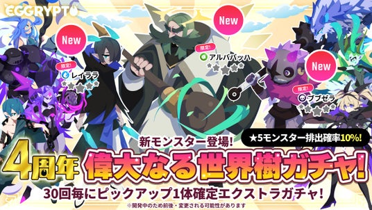 株式会社GameWith(本社:東京都港区、代表取締役社長:今泉卓也、以下「GameWith」)が、出資先であり事業パートナーである株式会社Kyuzan(本社:東京都渋谷区、代表取締役:高橋 卓巳、以下「Kyuzan」)と共同開発した、アプリで簡単に遊べるNFTゲーム「EGGRYPTO(エグリプト)」は、2024年4月20日でサービス開始から4周年を迎えました。これを記念して、4月20日(土)12時より、無料30連ガチャプレゼントや豪華ログインボーナスを含むの周年記念キャンペーンを開催いたします。さらに、通常モンスターがレアモン(NFT)に進化する新機能「進化システム」を実装する大型アップデートも実施いたします。