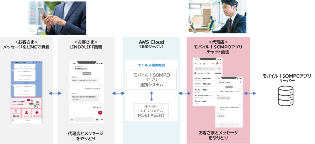 モビルスでは「モバイル!SOMPO」の新機能である「チャット機能」のうち、「MOBI AGENT」を活用したチャットシステムおよび「モバイル!SOMPO」連携システムを損保ジャパンのAWS Cloud上に構築しました。