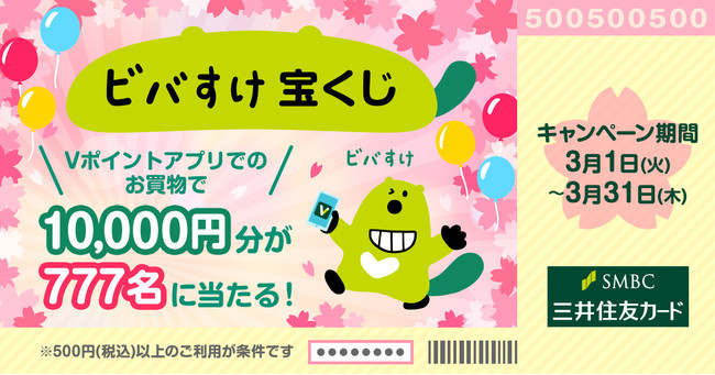 三井住友カード株式会社(本社:東京都江東区、代表取締役社長:大西 幸彦、以下:三井住友カード)は、スマートフォンアプリ「Vポイント」で500円(税込)以上のお買い物をされた方の中から、抽選で777名に10,000円分のVポイントギフトが当たるキャンペーンを実施いたします。