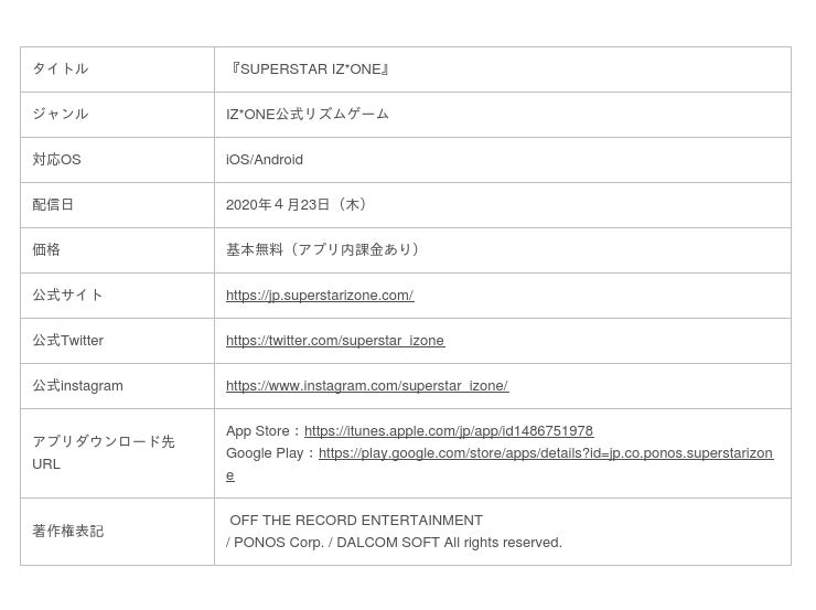 『SUPERSTAR IZ*ONE』は「IZ*ONE」のライブ映像で楽しめるリズムゲームです。「La Vie en Rose」、「好きと言わせたい」など人気楽曲のライブ映像を多数収録し、ハイレベルなパフォーマンス、ライブの臨場感をいつでもどこでも体験することができます。また、本ゲームだけでしか見ることのできないメンバーの写真や動画、ボイスが特典として登場し楽しむことができます。