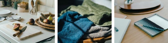 左 :世界三大刃物産地と言われる岐阜県関市の職人が作る「三徳包丁」 中央 :土壌・水質・農薬など環境へ配慮した農園で栽培された綿花を使用した吸水性の高い「フラッフィータオル」 右 :東京都葛飾区の老舗工場で作られる国産の芯を用いた、やわらかい書き味が特徴の「鉛筆」