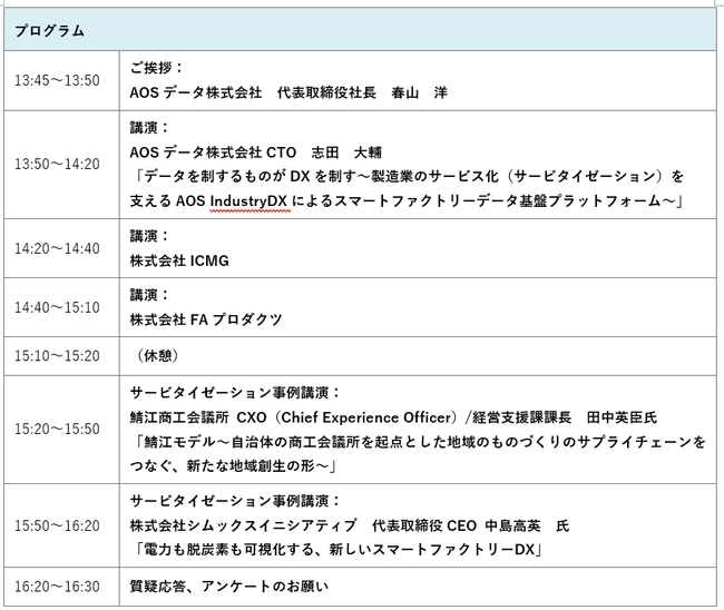 クラウドデータ、システムデータ、リーガルデータ、AIデータなどのデータアセットマネジメント事業を展開するAOSデータ株式会社(本社:東京都港区、代表取締役社長 春山 洋 以下AOSデータ社)は、製造業DXや産業用メタバース(デジタルツイン)の導入等を通し、サービタイゼーションを推進されているお客様事例を紹介し、ものづくりに携わる全国の企業様のDX推進に貢献することを目的に、「製造業DXと産業用メタバース~サービタイゼーション事例セミナー/メディア懇談会」を、9月13日(火)13時45分より日経カンファレンスルーム「A」にて開催いたします。