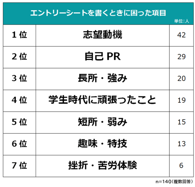 就活時にエントリーシートを作成した経験がある140人に「エントリーシートを書くときに困った項目」を聞いたところ、1位は「志望動機(42人)」でした。2位「自己PR(29人)」、3位「長所・強み(20人)」、4位「学生時代に頑張ったこと(19 人)」と続きます。