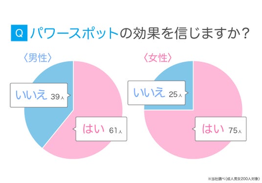 成人男女200人に、パワースポットの効果を信じているか尋ねたところ、「はい」と回答した男性は約6割、女性は7割強でした。