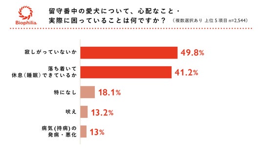 愛犬が留守番中の心配事は「寂しがっていないか」が49.8%、「休息できているか」が41.2%と、メンタルとフィジカル両方の心配がある。
