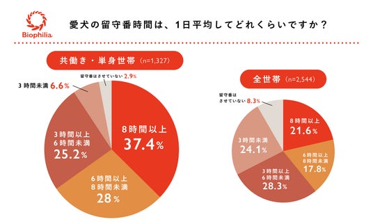 愛犬愛猫向け手づくりごはんブランドなどを展開する株式会社バイオフィリア(本社:東京都新宿区、代表取締役:岩橋洸太、以下、当社)は、愛犬の留守番実態と、それに伴う飼い主の見守り行動の実態を明らかにすることを目的に、全国の犬と暮らす飼い主さま2,544名を対象に、「愛犬の留守番と睡眠」に関する実態調査を行いました。また、本調査では、家を空ける機会が発生しやすい「共働き世帯・単身世帯(1,327名)」を抽出し、働き方と愛犬の留守番・見守り行動との関係についての傾向も分析しています。