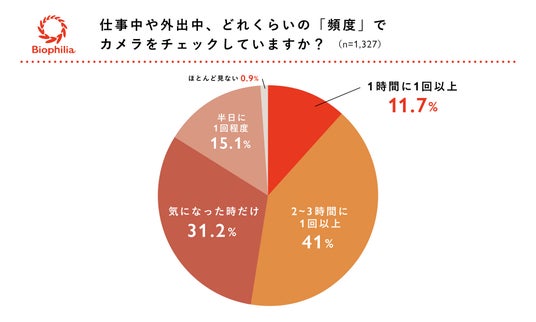 ・カメラを見る頻度は「2~3時間に1回」が41%、「1時間に1回以上」が11.7%と、約半数が外出中も定期的に確認