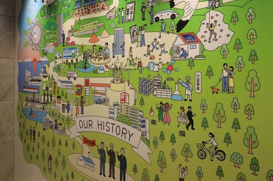 エントランススペースでは、季節に合わせたフラワーアートがお迎えします。正面のサイネージではシナネンホールディングスグループのイメージ動画の放映、これまでの歴史がイラストでわかるヒストリーボードの掲示、屋上に設置された太陽光パネルの発電状況の表示等を行っています。