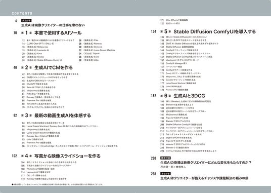 TVCM、映画、配信ドラマなどの現場で、映像ディレクターとして活躍する曽根隼人さんが、実際に生成AIを活用して作った映像をもとに、その作り方を解説していきます。生成AIは映像クリエイターの創作活動のためのアシストツールです。これをうまく活用することで少人数・短時間でもクオリティーの高い作品を作ることもできます。本書では実際の現場で生成AIを活用してきた曽根さんが生成AIとの上手な付き合い方についても優しく紐解いていきます。