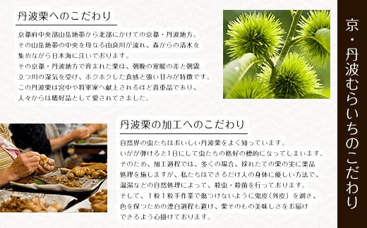 ホクホクした食感と強い甘味が特徴の丹波栗。一粒一粒手作業で傷つけないように鬼皮(外皮)を剥き、色を保つための漂白過程も避け、栗そのものの美味しさを楽しむことができます。