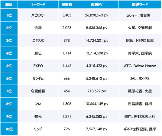 10位の「リング」は万博会場のシンボルである大屋根リングの話題。月初には世界最大の木造建築物としてギネス世界記録に認定されたことも大きく報じられました。しかしその件の22%ほどの記事数で8倍以上のPVを得たのが、リング護岸の浸食被害報道でした。