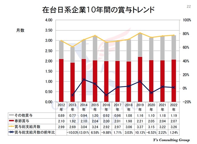ワイズコンサルティング グループ(本社:中華民国台北市、代表取締役:吉本康志)のワイズリサーチの最新調査によると、在台日系企業の2022年年末賞与(いわゆる2023年の春節賞与)の平均支給月数は2.07ヶ月となる。