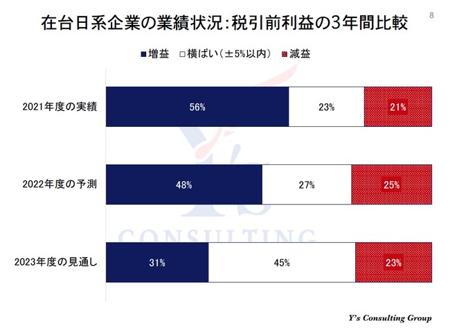 台湾における日系企業は増益企業が48%、前年比で8%減少