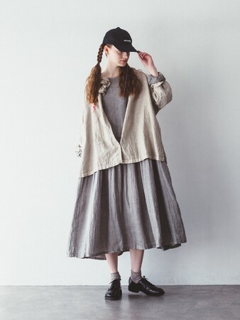 前後着用可能な2way仕様のワンピース。スカート部分には、細やかなギャザーを贅沢にあしらいボリュームを持たせました。スカート部分は、身頃よりやや薄手のリネンを使用することで、軽やかな印象に仕上げました。