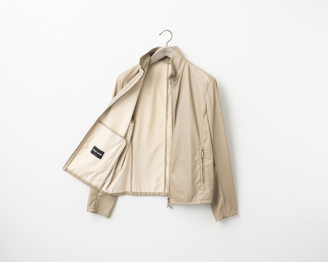 この素材でオーダーできるモデルはシンプルなジップアップブルゾンです。シングルタイプのブルゾンで、もたつきのないすっきりとしたフィット感が魅力です。豊富なガーメントサイズから選べ、かつショート、レギュラー、ロングの選択も可能です。色は軽やかなベージュとスポーティなネイビーの2色から選ぶことができます。シンプルでタイムレスなデザインは、さまざまなコーディネートが楽しめ汎用性も高く、長くご愛用いただけます。また裏地には、シルクシャンタンのような風合いのコットンがボンディングされ、スポーティな中に洗練を極めた雰囲気をブルゾン全体に醸しています。
