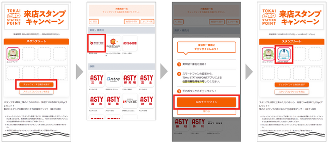 ※チェックインによってスタンプを獲得するには、GPS機能を搭載したスマートフォンが必要となります。携帯端末のGPS機能を有効とし、「TOKAI STATION POINT」アプリによる位置情報取得を許可した状態でご利用ください。