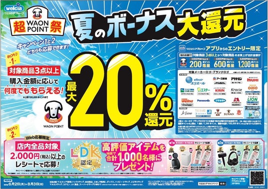 ウエルシア薬局株式会社(本社:東京都千代田区、代表取締役社長:田中純一、以下 ウエルシア薬局)は、2025年6月2日(月)よりウエルシアグループの店舗でお買い物をされたお客さまを対象にWAON POINTが最大20%還元される「ウエルシアグループ夏のボーナス大還元」を期間限定で開催することをお知らせします。