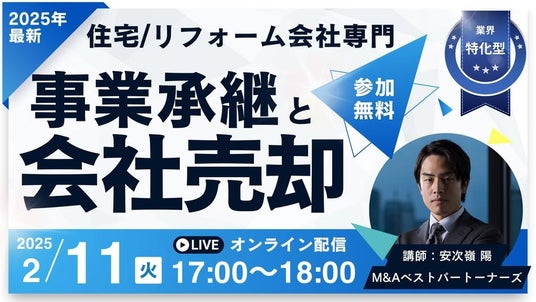 製造、建設、不動産、医療・ヘルスケア、物流、ITに特化したM&A仲介を行う株式会社M&Aベストパートナーズ(本社:東京都千代田区、代表取締役社長:齋藤 達雄 以下M&Aベストパートナーズ)は、2月11日(火)に【住宅・リフォーム会社の売却と事業承継 成功戦略セミナー】を、オンラインにて開催いたします。