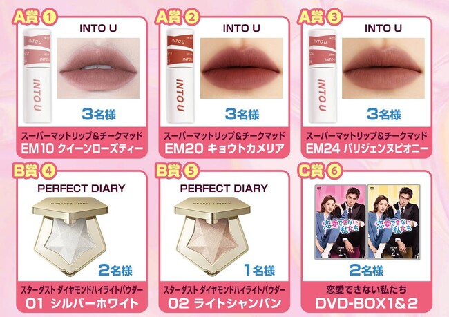 アジアで500万本以上を売り上げた話題の中国コスメ「INTO U」の“泥リップ”こと「スーパーマットリップ&チークマッド」から品切れ続出の人気カラー3色と、日本での中国コスメの火付け役として知られる「PERFECT DIARY」から、SNSで“まるで塗るダイヤモンド”と大バズリ中の「スターダスト ダイヤモンドハイライトパウダー」2色、そして人気急上昇中のドラマ「恋愛できない私たち」のDVD-BOXを抽選で計14名様にプレゼント!