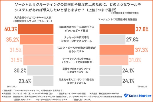 今後、ソーシャルリクルーティングの効率化や精度向上を図るうえで求められるシステムの要素として、「求職者の進捗を一元管理できるダッシュボード機能」「スカウトメールの自動送信機能」「ターゲット人材に合わせたテンプレートや文面例の提供」「反応率の可視化・分析」などが上位に挙げられました。