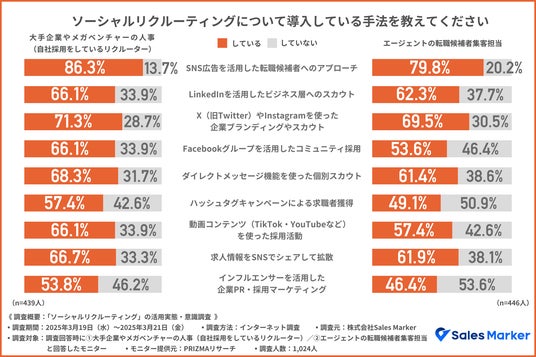 そこで、ソーシャルリクルーティングを実践している方に導入している具体的な手法を聞いたところ、大手企業やメガベンチャーの採用担当者の結果は、『SNS広告を活用した転職候補者へのアプローチ(86.3%)』が最も多くなりました。