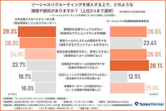 一方で、まだソーシャルリクルーティングを導入していない方に対して、導入に向けた課題や抵抗について問うたところ、大手企業やメガベンチャーの採用担当者の結果は、『実践的な活用マニュアルがない(具体的なアクションプランが不明確)(29.3%)』が最多になり、ノウハウ不足や活用基盤の不透明さが導入の壁となっていることが示されました。