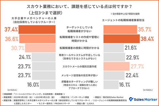 また、スカウト業務における課題について、大手企業やメガベンチャーの採用担当者は、『ターゲットとしている転職候補者が少ない(37.4%)』が最も多く、次いで『転職候補者リストの作成や管理に時間がかかる(36.6%)』『転職候補者の検索に時間がかかる(30.7%)』となりました。