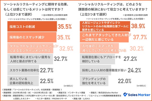 国内初※1インテント(個人の実現したいキャリア)に基づいた採用成功を後押しする、新時代の採用戦略「インテントリクルーティング」を実現する『Recruit Marker(リクルートマーカー)』を開発・提供する株式会社Sales Marker(本社:東京都渋谷区、代表取締役 CEO:小笠原 羽恭)は、大手企業やメガベンチャーの採用担当者および転職エージェント担当者1,024人を対象に、「ソーシャルリクルーティングの活用実態・意識調査」(以下、本調査)を実施しました。