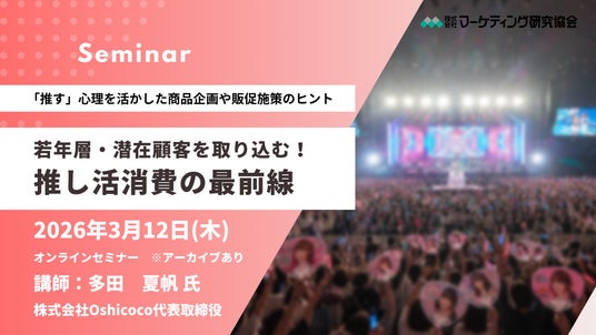 株式会社マーケティング研究協会は2026年3月12日オンラインセミナー「若年層・潜在顧客を取り込む!推し活消費の最前線」を開催します。 ※期間限定アーカイブ配信あり