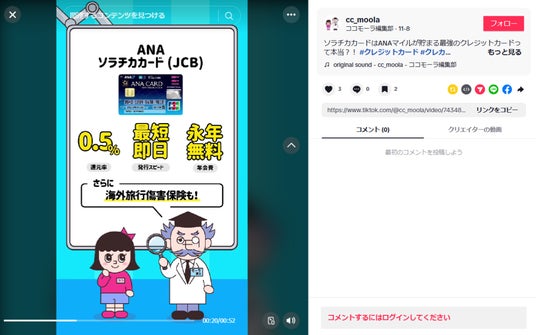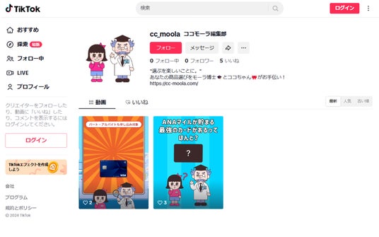 ココモーラでは、新たにTikTokの公式アカウント(@cc_moola)を開設しました。TikTokのメインユーザーである若年層を対象に、正しい知識をわかりやすく伝えることを目指しています。現在、「目的別のおすすめクレジットカード」を紹介する解説動画を公開中。クレジットカード以外にも、暮らしに役立つさまざまなジャンルのコンテンツを配信予定です。