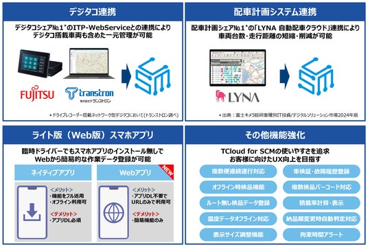 今回の機能追加では、デジタルタコグラフ(デジタコ)や配車計画システムとの連携機能や、Webブラウザを用いたライト版スマホアプリの提供により、お客様環境に広く対応し、SCMをデータ基盤として一元的に管理・分析できるようにしました。