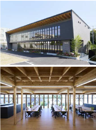 柱・梁・屋根を構造用合板の表しにし、木質感溢れる空間を演出、木造施設のショールームとして活用し、「居心地」や「働き心地」を訴求することで、木造施設建設を検討している事業者に幅広く認知してもらい、木造施設の普及に貢献してまいります。
